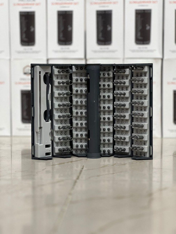 | توضیحات تعداد | این محصول که دارای 128 سری مختلف برای کاربردهای متنوع می باشد نیاز شما را بطور کامل می تواند برطرف کند حتی دارای یک نازل فنری برای مکان های بد دست می باشد که بتوانید پیچ های مناطق بد دست را به راحتی باز کنید. همچنین داخل این پک 2 اسپاتول فلزی و پلاستیکی و یک پنس سر صاف دقیق نیز وجود دارد که با توجه به این ابزارها این محصول بعنوان ابزار تعمیر موبایل و لوازم الکترونیکی یک محصول ایده آل می باشد نوع سریها: مربع، صلیب، تخت، بسته دو سو، چهارسو، سه پر- آلن- ستاره ای 5گوش- ستاره ای 6 گوش … G4.5/0.B/1.0/0.1//0.3/SCRAPE/T2/T3 G3.8/OVAL/PH2/IN PH2/IN Y2/PRY/T1/T2 M2.5/M3.0/M3.5/M/4.0/M4.5/M5.0/M5.5/ T5/T6H/T8H/T9H/T15H/Y000/Y00/Y1 T4/T6H/T7H/T9H/T10H/T25H/Y000/Y0 T4/T5/T7H/T8H/T10H/T20H/Y000/Y00 AP2/AP5/2.5/PH000/PH000/PH00/PH1/PZ0 AP2/AP5/2.0/PH0000/PH000/PH00/PH1/PH2 Y2/AP2/AP6/PH0000/PH00/PH0/PH2 SL1.0/SL1.3/SL2.5/SL4.0/H0.7/H1.5/H2.0/H3.5 PZ2/SL1.3/SL2.0/SL3.5/SL5.0/H1.3/H2.0/H3 PZ1/SL1.0/SL1.5/SL3.0/SL4.5/H0.9/H1.5/H2.5 H5/U6/مثلثی2.0/مثلثی3.0/SQ2/H5-64/H1-8/H3-16 H4.5/U4/U10/مثلثی2.6/SQ1/H1-16/H7/64/H5-32 H4/H6/UB/مثلثی2.3/SQ0/SQ3/H3-32/H9-64 دارای سری های کامل و بسیار باکیفیت |