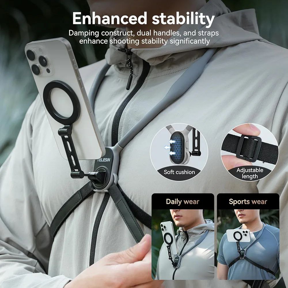 هولدر گردنی Telesin یک ابزار حرفهای و کاربردی است که استفاده از موبایل و دوربین را سادهتر، ایمنتر و راحتتر میکند. با این هولدر میتوانید لحظات خود را بدون نگرانی از افتادن دستگاهها ثبت کنید و دستهایتان را آزاد نگه دارید